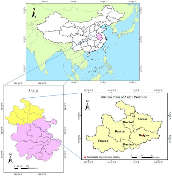 The Huaibei Plain in Anhui Province is located in the south of the Huang-Huai-Hai Plain (Figure 1). The climate is northern subtropical with warm temperatures and a semi-humid monsoon climate, characterized by dry winters with little rainfall and hot summers with abundant rainfall [37]. The mean annual precipitation is 850 mm, the mean annual temperature is 14.7 °C, and the frost-free period lasts for more than 206 days [38]. The inter-annual and intra-annual distribution of precipitation is uneven, with great inter-annual variations, causing frequent agricultural droughts that directly impact the growth of the winter wheat in the Huaibei Plain. The droughts have a catastrophic impact on the crops and the overall regional economy as the Huaibei Plain is one of the main wheat-producing areas in China, and winter wheat is the main grain crop in such areas [37,39].