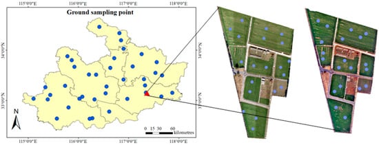 The UAV observations were conducted at the Xinmaqiao Comprehensive Agricultural Water Conservancy and Irrigation Test Station. The test station is located in Guzhen County, north of Bengbu, at an altitude of 19.70 m (33°09′ N, 117°22′ E). The soil type in the test area is lime concretion black soil, and the soil texture is clay loam, which is the main soil type in the area [40]. The geographical environment, natural conditions, and crop cultivation at the test station are representative of the Huaibei Plain [41]. The UAV imagery and manual sampling of the soil were carried out at the same time. In total, 20 manual soil-sampling points (40 groups) were arranged on the ground (Figure 2), and the observation depths of the soil were set to 0–10 cm, 10–20 cm, and 20–40 cm, respectively. According to the data of the stratified field capacity at the test station, the measured values were calculated as the relative soil moisture (RSM). During the selection of sampling points on the ground, a Trimble GEO 7X centimeter hand-held GPS instrument was used to calibrate the longitude and the latitude in order to obtain the information of corresponding points on the remote sensing images.