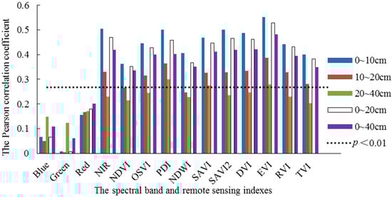 The Pearson correlation between the band reflectance and the agricultural drought indexes of the Landsat remote sensing data and the measured relative soil moisture was analyzed, and a preliminary analysis of the degree of correlation between the relative soil moisture and different spectral indexes was performed. The results in Figure 3 show that the relative soil moisture at a depth of 0–20 cm was the mean value of the relative soil moisture at depths of 0–10 cm and 10–20 cm, and the relative soil moisture at a depth of 0–40 cm was the mean value of the relative soil moisture at depths of 0–20 cm and 20–40 cm. Significance tests were conducted by referring to the table of critical values for correlation coefficient tests, and individual abnormal data, i.e., negative reflectance and spectral indexes were eliminated. The number of sample data points was 92 and the corresponding degree of freedom was 90. When the absolute value of the coefficient of correlation was greater than 0.267, the significance level reached 0.01. As shown in Figure 3, among four bands, the relative soil moisture at the depths of 0–10 cm, 10–20 cm, 0–20 cm, and 0–40 cm only reached the significance level within the NIR band. The near-infrared band was within the high-reflectance area of the crop, which is commonly used for crop identification and has a strong correlation with soil moisture. Therefore, there was a strong correlation between spectral indexes such as the PDI, SAVI, SAVI2, and EVI established on the basis of this band and the relative soil moisture in these four soil layers. Compared with the other depths, the coefficient of correlation between the soil moisture content at a depth of 20–40 cm and each band and spectral index was the smallest, and only the correlations with the PDI and EVI were significant. These results are consistent with the research conclusions in [49]. The possible reason for this is that, as the soil depth increases, the capability of remote sensing inversion declines.