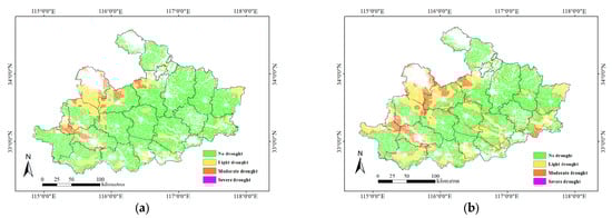 Agricultural drought grade distribution map of Huaibei Plain in Anhui Province based on model inversion. (a) November, (b) December.