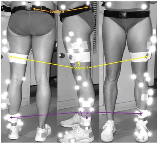 IMUs were secured unilaterally to the runner’s left shank (Sensor 1) and left thigh (Sensor 2) with double-sided tape (Logemas Pty Ltd., Albion, Australia) and elastic adhesive bandage (Elastoplast, Beiersdorf Australia Pty Ltd., North Ryde, Australia). Sensor 1 was positioned approximately 3–4 cm above the lateral malleolus and Sensor 2 on the mid lateral thigh. The final IMU was worn centrally on the sacrum via a Noraxon myoMOTION pelvic strap (Sensor 3) and reinforced with rigid tape (Elastoplast, Beiersdorf Australia Pty Ltd., North Ryde, Australia). Vertical IMU alignment when standing was checked and ensured.