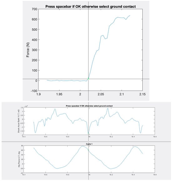 Matlab (9.13.0 (R2022B), The MathWorks Inc., Natick, MA, USA) software was utilised for POC determination for MAS and IMU system trial data. For the MAS force plate data, POC was determined by a threshold selection of the summed vertical ground reaction force (Figure 3) and the first data point above the baseline force level. For the IMU system, POC was identified using the shank IMU’s vertical, earth-based accelerometer data (axial axes). Shank accelerometer data were chosen to minimise impact transmission time lag from the collision point/feet to pelvis [32]. The first negative minima in acceleration trace after maximal hip flexion was manually identified for each stride cycle (Figure 3).