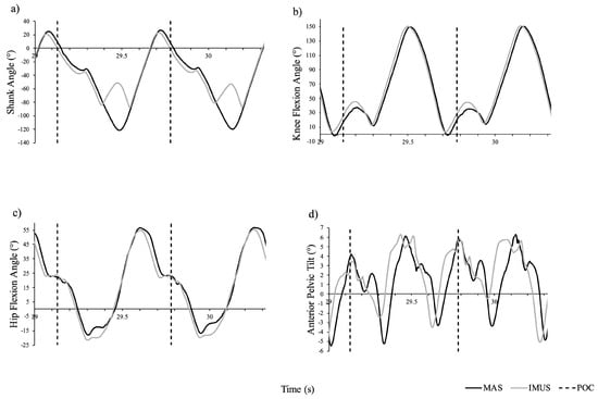 Over 5 s at each speed (12, 14, 16 and 18 km/h), a total of 38 strides per trial, were collected. An example of kinematic data obtained through the entire stride cycle as identified by respective MAS and IMU system methods (before extraction of POC kinematic data) is displayed in Figure 4. Descriptive statistics for POC identification; sagittal plane pelvis, hip, knee and shank angle; and stride time are shown in Table 1 and Bland–Altman plots (Figure 5). Additional data provided in Appendix A include individual plots for each variable across speed.