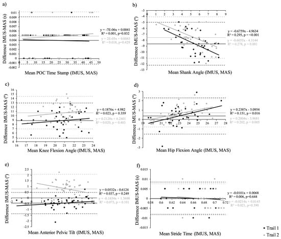 Bland–Altman Plots (mean difference plotted against the average of each measurement pair) for (a) point of contact (POC), (b) shank angle, (c) knee flexion angle, (d) hip flexion angle, (e) anterior pelvic tilt and (f) stride time for Trial 1 (black) and Trial 2 (grey).