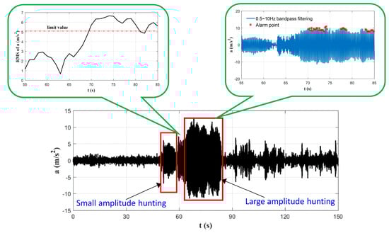 The lateral acceleration of the bogie frame directly reflects the dynamic behavior of the bogie. Additionally, the cost of signal-acquisition devices is relatively low, and their installation is straightforward. Consequently, most existing evaluation standards rely on the lateral acceleration signals of the bogie frame to diagnose the occurrence of hunting instability. Various methods can be used to evaluate hunting instability through these acceleration signals, with the root mean square (RMS) method and the peak value method currently employed in the standards.