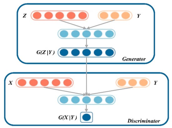 The lateral acceleration measured at the ends of the bogie frame can simultaneously reflect both the rocking and lateral displacement modes of the bogie. Most existing research relies on this singular signal source (the lateral acceleration of the bogie frame) to diagnose the occurrence of hunting instability. Bruni et al. [31] defined the stability region of hunting motion based on online measured acceleration by employing the Random Decrement Technique (RDT) and Prony’s method (complex exponential model). This approach avoids the traditional numerical modeling process and directly estimates the hunting frequency from the autocorrelation function, enabling the effective identification of early hunting instability. Li et al. [32] developed a novel instability detection system for EMUs based on bogie vibration signals and adjusted the alarm threshold for small-amplitude hunting to . In [33], Wang et al. focused on bogie frame acceleration signals and proposed a research method based on 1D CNN and LSTM, which effectively identifies small-amplitude instability. Ning et al. [34] collected lateral acceleration signals from high-speed train bogies for their study. To address the issue of data imbalance in the measurements, they proposed a prediction method based on 1D-CNN and CGAN (the structure of the CGAN network is illustrated in the Figure 2). The core of this method lies in utilizing the CGAN model to augment the original data sample space, effectively addressing the significant challenge of sample imbalance in diagnostic tasks. With a prediction accuracy of up to 97.5%, this method demonstrates substantial superiority over several comparative approaches and is highly effective in providing early warnings of hunting instability. However, this model is limited to fitting the original data rather than generating new, authentic data. As a result, the sample space after data augmentation remains quite limited in diversity.