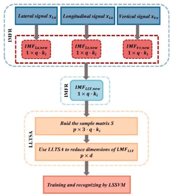 The aforementioned studies predominantly employ single-signal approaches for fault diagnosis. However, hunting instability typically entails a complex nonlinear relationship wherein multiple factors contribute to diverse outcomes. Relying solely on data from a single measurement point is insufficient for effective fault tracing and diagnosis. Consequently, numerous researchers have investigated multi-source information fusion techniques within the domain of hunting motion diagnostics. Given that a single sensor cannot fully capture the operational conditions of the bogie, Liu et al. [35] employed a network system incorporating multiple acceleration sensors to develop a method for identifying high-speed train lateral instability fault states using D-S evidence theory. Compared to any single sensor diagnosis, his approach exhibits superior performance in distinguishing normal conditions, small-amplitude hunting motion, and significant hunting fault states. It represents a pioneering application of multi-sensor fusion technology in high-speed trains. Building upon Liu’s research, Ning [36] introduced an advanced multi-sensor fusion framework utilizing an enhanced D-S theory. This framework integrates empirical mode decomposition (EMD) and sample entropy methods to extract non-stationary features from the data provided by each sensor. It constructs a posterior probability support vector machine (PPSVM) model to derive basic probability assignments, which are then refined using the improved D-S theory for weighting. This method yielded results with exceptionally high confidence levels. The multi-sensor data fusion system significantly enhances system reliability and robustness, extends the observational range across both temporal and spatial dimensions, and improves the credibility of the data, as well as the resolution of the system. However, Ning’s method relies exclusively on lateral acceleration signals to evaluate the fluctuation state, while it does not fully integrate longitudinal and vertical vibration signals. Therefore, Ye et al. [29] proposed a method that combines lateral-longitudinal-vertical data fusion from the bogie frame with IMFR-LLTSA. This approach utilizes EEMD to decompose vibration signals from the three directions of the bogie frame, reconstructing them into a new vector, IMFLLV. The LLTSA is then employed to obtain an adaptive low-dimensional feature matrix, effectively utilizing the nonlinear dimensionality reduction capabilities of manifold learning to extract inherent structures from high-dimensional datasets, thereby mitigating the challenges associated with feature selection, and the technical scheme is illustrated in the Figure 3. This method was applied to CRH380A high-speed trains operating on the Shanghai-Hangzhou line. Experimental results demonstrated that this approach significantly outperforms other methods relying solely on lateral acceleration. Sun et al. [27] proposed a simple, efficient, and highly cost-effective algorithm that relies solely on basic signal analysis techniques. The algorithm collects nine vibration signals from different parts and directions of the train’s structure and body and pairs them to form correlation indices. By analyzing the variation patterns of these indices during the fault evolution process, the algorithm identifies the most indicative indices for detecting hunting instability. It not only detects small-amplitude instabilities but also distinguishes between the two different states of small-amplitude instability: small-amplitude divergence and small-amplitude convergence. To investigate the hunting motion in bogies of subway trains operating at relatively low speeds, Zheng et al. [37] conducted field tests to measure the vibration accelerations of the axle-box, bogie frame, and car body floor. They also measured the relative displacements between the frame and the wheelset and between the brake caliper and the wheelset, to evaluate the vehicle’s vibration characteristics. In [38], Kulkarni introduced an indicator, CHI, which integrates phase and amplitude information from both lateral and longitudinal axle-box accelerations to detect coupling modes in the lateral and yaw directions. Under unstable wheel-rail contact conditions, the phase angle difference between longitudinal and lateral accelerations remains unaffected, allowing this method to effectively identify hunting states in practice. However, since the phase angle difference between these two accelerations varies depending on the vehicle, applying the CHI index without a specific vehicle model becomes a highly challenging task. The CHI, obtained by multiplying FHI and PDHI, can independently assess the dynamic instability of each wheelset.
