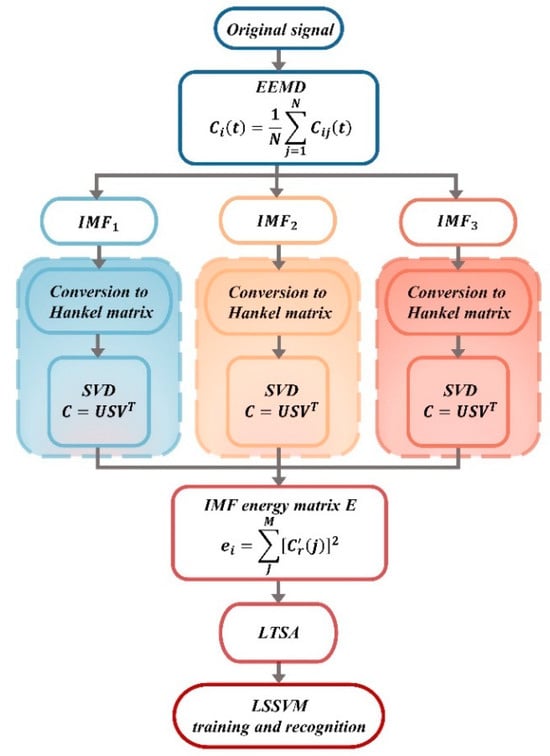 After obtaining the IMF components, perform SVD denoising and LTSA dimensionality reduction to extract features. The framework for feature extraction is illustrated in Figure 4. Experimental results demonstrate that features extracted using this framework can successfully identify whether the evolution trend is small-amplitude divergence or small-amplitude convergence and accurately predict the operational status of the train. Cui et al. [45] employed a feature extraction methodology based on Empirical Mode Decomposition (EMD) in conjunction with manifold learning and compared it to a feature extraction approach using wavelet transform. Their results indicated that features extracted via the EMD-ISOMAP technique exhibited superior performance in distinguishing small-amplitude hunting instability compared to the time-frequency domain features derived from wavelet transform.