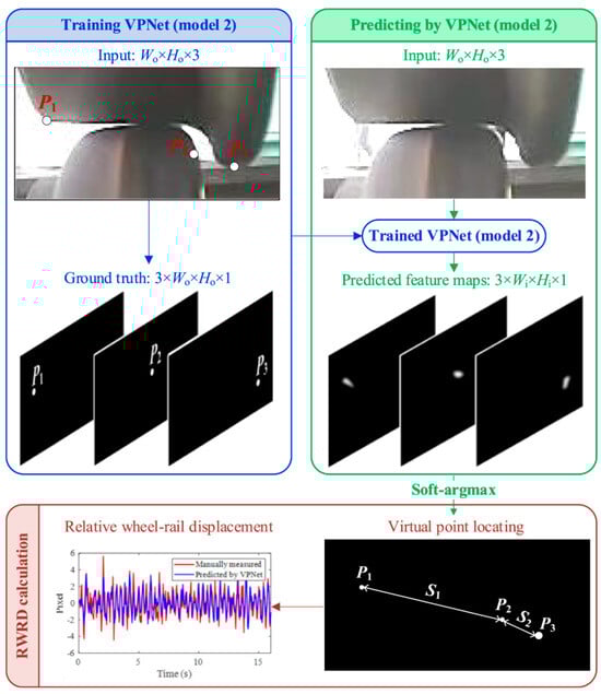 Most features used to identify hunting oscillations in high-speed trains are derived from processing acceleration signals. The acceleration of the bogie frame, which results from the relative motion between the wheel and the rail, is influenced by factors, such as wheel-rail profiles, structural elasticity, and suspension parameters [48,49,50]. As such, it may not provide an intuitive reflection of the train’s safety status. Evaluating the stability of hunting oscillations from the perspective of wheel-rail dynamic interactions is more reliable. As computer vision (CV) technology came into the limelight, machine vision-based wheel–rail interaction detection methods were discovered and applied to the field of hunting state recognition. Shi et al. [51] proposed a virtual point detection method based on deep learning (DL) to detect rail wheel running dynamics (RWRD) and developed a system for measuring lateral track irregularities. Traditional image processing methods, such as edge detection and template matching, tend to suffer from performance degradation in dynamically complex backgrounds and are heavily dependent on parameter settings. To overcome these limitations, the system’s algorithm avoids traditional methods in favor of using YOLOv3-tiny to capture regions of interest (ROIs) in the input images. These ROIs are then fed into a DL model called LightPointNet, which outputs feature maps corresponding to the virtual points on the ROI. Although this method has not yet been applied to the detection of hunting motion in railway vehicles, it proves the feasibility of using DL-based virtual point detection methods to identify hunting stability. Therefore, building on Shi’s study, Ye et al. [52] applied the virtual point detection method to extract features from images for predicting and identifying the rail wheel running dynamics (RWRD) and hunting frequency. The principle of detecting hunting motion with this method involves the following: first, defining multiple virtual points on each frame extracted from the wheel-rail contact video; then, automatically detecting the coordinates of these defined virtual points using a DL model, denoting the points as P1(y1, z1), P2(y2, z2), and P3(y3, z3); and finally, calculating the relative displacement (S1,k and S2,k).