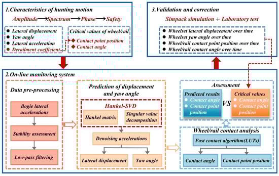 Assessing the operational safety of high-speed trains is the primary task in conducting hunting instability diagnostics. In the absence of wheel-rail force data, some researchers have attempted to evaluate hunting instability based on the relative lateral displacement between the wheel and rail. Examples include trackside monitoring systems based on displacement sensors [61] and onboard monitoring systems utilizing computer vision [52]. In addition to directly measuring the relative displacement between the wheel and rail, Sun et al. [62] developed a method for evaluating hunting instability in high-speed trains based on lateral acceleration from the bogie. Utilizing Hankel-SVD technology, they predicted the lateral displacement and yaw angle of the wheelset and, combined with wheel-rail profile data, forecasted the wheel-rail contact relationship; the technical approach is illustrated in the Figure 8. This method, which employs only two sensors to predict the wheel-rail contact for the front wheelset of the leading bogie, achieves a balance between monitoring system accuracy and cost-effectiveness. However, this diagnostic approach is constrained by technical limitations, as the testing system is susceptible to environmental influences, such as lighting conditions, dust, rain, and track irregularities, which can affect the accuracy and resolution of displacement measurements.