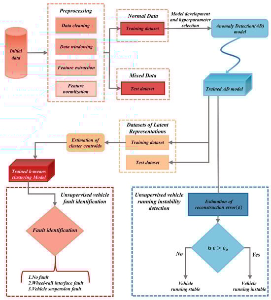 Bruni et al. [63] simulated various wheel-rail matching conditions and yaw damper performances to generate instability signals under different fault scenarios. They employed stochastic reduction techniques alongside the Prony method to extract fault features and then used Artificial Neural Networks (ANNs) and k-Nearest Neighbors (k-NN) methods for fault detection and isolation. Kulkarni et al. [64] introduced an unsupervised instability detection framework (iVRIDA) for identifying instability phenomena during train operations, as depicted in Figure 10. This framework employs the k-means algorithm to perform cluster analysis on the fault factors causing instability, aiming to achieve fault localization. However, the fault factors considered in the studies referenced are not comprehensive, and the effectiveness of fault localization is not ideal.