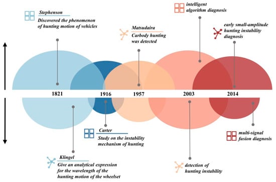 Investigating the underlying mechanisms of hunting instability is crucial for accurately identifying its state. Understanding the fault mechanisms and characterization methods not only aids in uncovering the intrinsic features of the fault and establishing reasonable fault models [65] but also guides the development of effective control and mitigation measures. The hunting instability in rail vehicles has been studied extensively over the course of nearly two centuries. The historical research progress of hunting stability is illustrated in the Figure 11. In 1821, Stephenson [66] firstly observed the phenomenon of hunting motion. Later, in 1883, Klingel [67] provided the first analytical expression for the wavelength of hunting motion in wheelsets, advancing the understanding of this oscillatory behavior. In 1916, Carter [68] identified that the root cause of hunting motion lies in the creep phenomena between the tapered treads and the rail. This discovery initiated the exploration of the causes and influencing factors of hunting instability. Further advancements were made in 1957 when Matsudaira [69] discovered two distinct types of hunting motions, which he termed primary and secondary hunting; primary hunting occurs at lower speeds and is associated with the lateral motion of the vehicle body. By 2003, international standards, such as EN14363 [21], UIC518 [22], and TSI L84 [25], were established, using the filtered lateral acceleration signal of the bogie frame to determine the presence of bogie hunting instability based on whether the data exceeded a certain threshold. Recently, in 2017, many researchers [70,71,72] have been dedicated to developing methods to evaluate the level of vehicle body swaying caused by carbody hunting instability. The study of the mechanism of hunting stability remains a crucial research topic in railway vehicle dynamics. The diagnostic methods for hunting instability and the investigation of its underlying mechanisms are complementary to each other. Mechanistic research aimed at diagnosing hunting instability primarily includes the following three aspects: (1) factors influencing hunting stability and their patterns, (2) the dynamic degradation mechanisms in the case of hunting instability, and (3) the common characteristics of hunting instability.