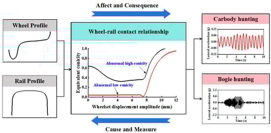 The deterioration of the wheel-rail contact geometry is a major cause of hunting instability and significantly impacts the hunting stability of railway vehicles. The concept of equivalent conicity, derived as a linearized parameter of the wheel-rail contact system, has been proposed and widely adopted in the global railway industry to characterize and evaluate the wheel-rail contact condition. As shown in Figure 12, abnormal wear on the wheels and rails leads to deviations in the equivalent conicity, which in turn causes hunting instability. Therefore, the hunting stability of railway vehicles is closely related to the equivalent conicity of the wheelsets, which has been extensively researched by scholars. Wang [19] and Shi [4] observed hunting instability phenomena in bogies during long-term service tracking tests of high-speed trains. They pointed out that abnormal high conicity resulting from concave wear on the wheel tread is a key factor triggering instability. Chi et al. [73] conducted a simulation analysis to investigate the impact of excessive railhead grinding on wheel-rail contact matching and vehicle stability. They found that, under conditions of excessive railhead grinding, the contact points between the wheel and rail tend to cluster around the tread root and rail shoulder, leading to an abnormal increase in equivalent conicity. This abnormal conicity can trigger hunting instability in the bogie. Furthermore, deviations in wheel-rail matching conicity not only cause bogie hunting instability but, when excessively low, can also lead to high-amplitude oscillations and body hunting instability. Such issues typically arise early in the wheel tread wear process. Based on measured data and simulation analysis, Sun et al. [14,73,74] discovered that abnormal low conicity resulting from wheel tread flattening, excessive rail shoulder wear, and excessive rail cant are the causes of body hunting instability. Additionally, excessively high block hardness and sustained high-pressure operating conditions are identified as the causes of abnormal wheel tread wear. Feng et al. [75] investigated the body sway phenomenon following wheel re-profiling and found that this re-profiling method shifts the wheel profile towards the flange, leading to a reduction in equivalent conicity and consequently triggering body hunting motion. Additionally, variations in the friction coefficient within the wheel-rail interaction may also affect the stability of hunting motion. Li [76] conducted a multibody dynamics simulation study and found that when the wheel-rail friction coefficient is low, the vehicle is prone to head shaking.