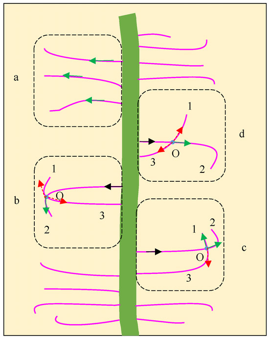 When the root hair had a small or moderate curling angle (Figure 3a), the angle change was relatively small or moderate. When the root hair had a large curling angle (Figure 3b), the changed direction curling angle could reach more than 225° (Supplementary File S2). The root hair curling angle represents the changed angle from the vector and (Figure 3). It is defined as: