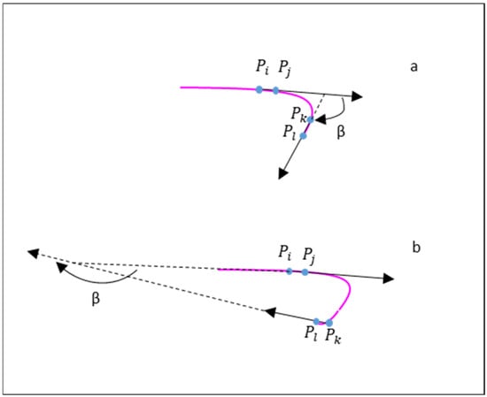 where β is the angle between the vector and , · is the inner product, and dL is root hair length from point to . is selected as the 1/2 root hair here since root hair curling always occurs at the root hair end in soybean–rhizobia symbiosis. is the point 5 pixels forward, is the endpoint, and is the point 5 pixels backward.