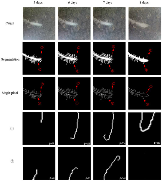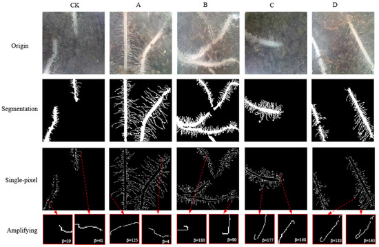 B. japonicum strains Parasponia Bradyrhizobium strain ANU289 (Institute of Plant Protection, Jiangsu Academy of Agricultural Sciences) at very low (105–106 viable cells per Leonard jar), low (106–107 viable cells per Leonard jar), medium (107–108 viable cells per Leonard jar), and high (108–109 viable cells per Leonard jar) inoculant doses were used in this experiment. Viable cell numbers were determined by dilution platings on a normal Rhizobium growth medium. Two-week-old seedlings were flood-inoculated with water (control), very low, low, medium, and high ANU289 suspension (200 mL/plant), named Control group, A group, B group, C group, and D group. Monitoring was carried out every day from inoculation to nodule formation (50th day after inoculation). The elongating zone and mature zone with growing root hairs were the target areas for observation. The captured images each day (16:00–17:00) were transmitted wirelessly to the terminal device for further processing. Root hair images were segmented based on deep learning and prior knowledge (Figure 1) (Supplementary File S1); see also in [33]. The proposed model was implemented in Python 3.6, where Keras 2.2.4 and TensorFlow-GPU 1.15.0 were used. The hardware platform is the Intel(R)Core(TM)i7-7700 CPU@3.60 GHz, 8.00 GB memory. GPU is NVIDIA RTX3060, 12 GB memory.