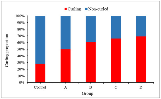 The curling angle in the infected group was larger than that in the uninfected group on the 6th day (Figure 6 and Figure 7). In the uninfected group, the curling angle did not change much over the range of the growing stage. However, it was worth noting that even in the uninfected group, some small deformations occurred, which implied that root hairs were not always straight and a threshold should be set to determine curled root hairs in soybean–rhizobia symbiosis. Figure 8 displays the root hair curling proportion on the 8th day. There was a proportion of curling root hairs in the control group. This was because not all the root hairs were straight, and deformation with a small curling angle was also regarded as curling root hairs. So, in further analyses, only a curling angle over 90° was taken into consideration as real curling root hairs.