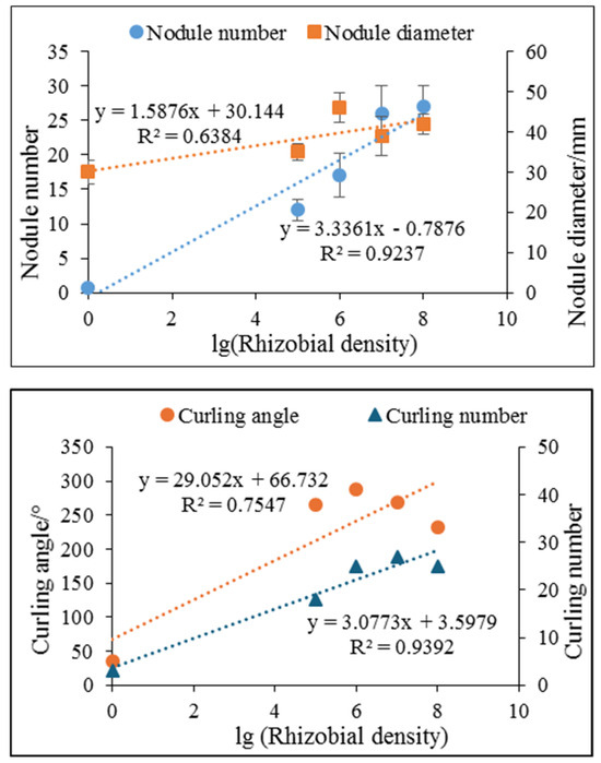 Linear regression analysis was conducted between the nodule/curling hairs and the rhizobia density applied in the soil (Figure 10). Regressions for nodule number per plant versus rhizobia density had a high correlation coefficient of determination (R2 0.92), suggesting that nodule number was strongly related to rhizobia density. Regressions for curling number versus rhizobia density also had a relatively high correlation coefficient of determination (R2 0.93), suggesting that curling number was strongly related to rhizobia density. On the contrary, the coefficient of determination for nodule diameter versus rhizobia density was 0.63, and the coefficient of determination for curling angle versus rhizobia density was 0.75. These results demonstrated that high or low rhizobia density did not affect nodule diameter or root hair curling angle a lot, but it did determine curling number and nodule number. Thus, the experimentally derived equation quantitatively described nodule number as a function of rhizobia density. For non-destructive and long-period experiments, nodule numbers could be estimated through the linear relationship.