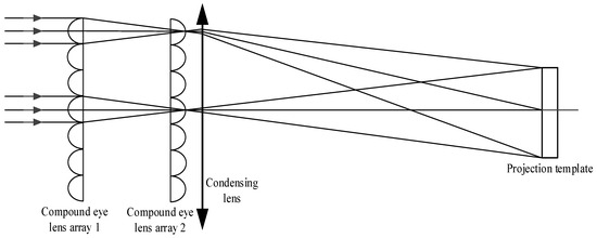 The imaging principle of convex lenses serves as the foundation for the projector (as illustrated in Figure 2). The light emitted by the modeling lamp and the flash is refracted through a series of optical elements, including the condensing lens and the uniform optical device, resulting in significantly improved uniformity. Finally, the light passes through the corresponding aperture holes on the projection template and a set of convex lenses, forming a highlighted point on the surface of the measured object [17,18]. Among them, the uniform optical device uses a compound eye lens, which is made up of a series of small lenses [15,16]. The use of a double-row compound eye lens array can result in high light energy utilization and uniform illumination over a large area.
