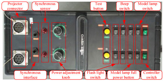 In principle, an optical projector consists of two parts: the projector and the controller, which are connected by a cable (Figure 1). The projector consists of various components, including a control circuit board, reflective bowl, modeling lamp, spiral flash lamp, condenser lens, uniform optical device, and projection template. The controller consists of a power supply component and a projector control panel, which are used to configure the projector’s power parameters and power supply (Figure 3). Typically, the optical point feeder is equipped with a number of different points of templates that can be selected based on the measurement requirements in practical applications [19,20,21].