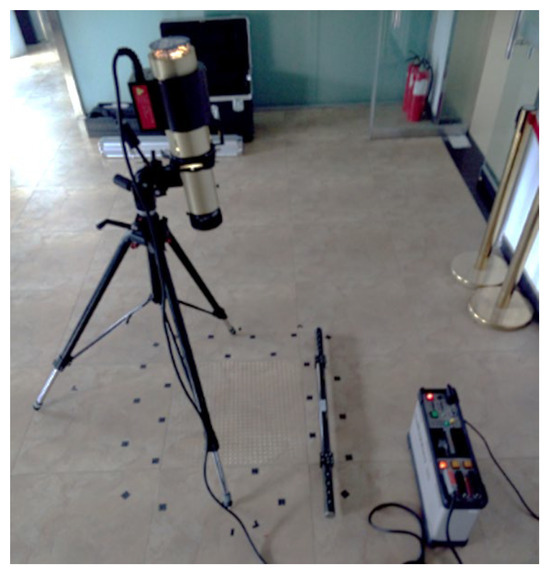 A tile with a relatively flat area of 600 mm × 600 mm is selected as the measurement object, and the coded target points are evenly distributed within a 200 mm wide range around it to complete the test site layout (Figure 9).