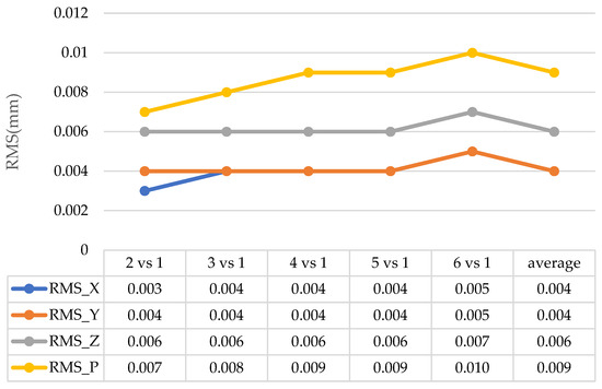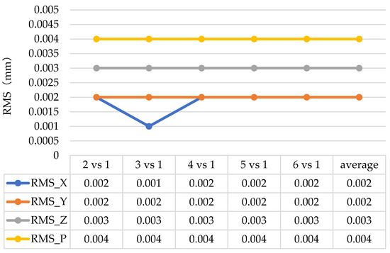 Repeatability refers to the accuracy with which the same quantity is observed multiple times, indicating the repeatability and stability of the system [23]. The targets are measured repeatedly according to the same measurement network shape, and then the coordinates of the measured object points are converted to common points. In common point conversion, the coordinates of the landmarks in the first group are generally used as the basis for common point conversion. Finally, the RMS of all the landmarks measured by the two groups is calculated according to the difference in the coordinates of the same landmarks. The RMS value reflects the dispersion of multiple measurement results, so as to reflect the stability of the camera [24].