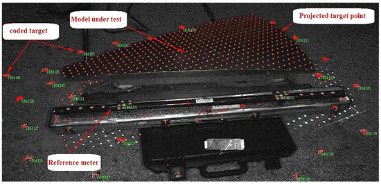 In order to solve the problem and splice the image, it is necessary to arrange the control field evenly around the tested object. The control field was composed of approximately forty 3 mm coded targets arranged evenly and reasonably around the marble platform (as shown in Figure 18). Then, the projector parameters (including projection direction, distance, aperture, and flash brightness) and camera shooting parameters (including time of exposure and flash intensity) were optimized and tested. The optimal parameters were selected according to the brightness of the targets and background in the obtained images. After optimization, the parameter settings were as shown in Table 7.