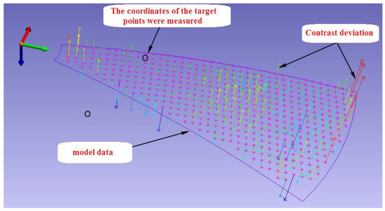 The surface of the mold was measured with the appropriate mesh shape using the best parameters, and five sets of continuous measurements were made. The measured three-dimensional coordinate values were processed and analyzed based on the measurement repeatability and compared with the model data of the measured mold surface. The shortest distance from the target point to the measured model surface is called the contrast deviation of the feature point from the model (see Figure 14). The root-mean-square of the contrast deviation is called the surface standard deviation, which represents the measurement accuracy of the shape surface.