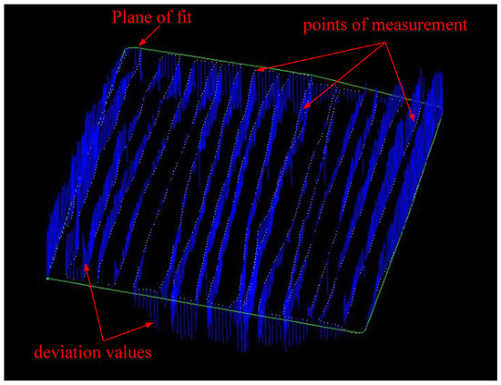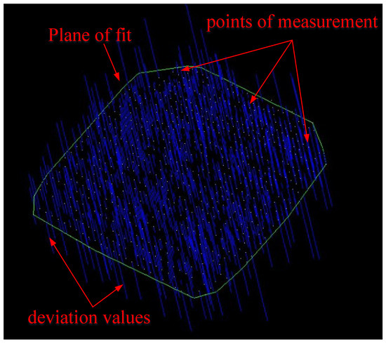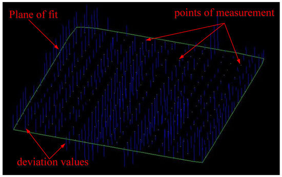 When the single-point measurement mode was adopted, the measurement points were evenly distributed according to the size of the measured surface. The specific layout method is as follows: A measurement point was distributed on the measured plane at an average interval of about 3 cm in the vertical and horizontal directions, that is, 400 measurement points were uniformly distributed by the method of 20 mm × 20 mm. The single-point measurement mode of the laser tracker was used to measure these points successively. After all the measurements were completed, the measured point coordinates were exported and imported into the MPS/S software(MPS 4.0.0) for plane fitting (see Figure 16).