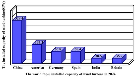 Wind energy plays an extremely important role in the transition to clean and sustainable energy sources. Particularly noteworthy is wind power generation, capable of large-scale production, where the significance of increasing the efficiency of power generation systems, such as through facility optimization and operation and maintenance (O&M) cost reduction, is rising as wind turbines grow in size [1,2,3]. On 16 April 2024, the Global Wind Energy Council (GWEC) released the Global Wind Energy Report 2024 in Abu Dhabi. The report showed that, in 2024, the world’s newly installed wind power capacity reached a record-breaking 117 GW, the best year in history. Figure 1 shows the top six countries with the world’s largest installed capacity as of 2024.