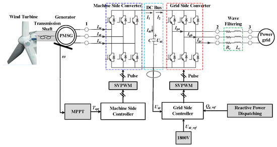 Figure 2 shows the structural diagram of a wind power generation system. It can be seen that the wind power generation system mainly includes a wind turbine, transmission chain, generator, converter, filter circuit, transformer, etc. Among them, the control goal of the machine side is to maintain the constant output power of the unit, that is, to keep the maximum wind energy tracking below the rated wind speed and the pitch control above the rated wind speed. The main control goal of the network side is to maintain the DC bus voltage constant, and its control strategy is mainly unit power factor control. By modeling the wind turbine, we can obtain the nonlinear motion equation of the wind turbine: