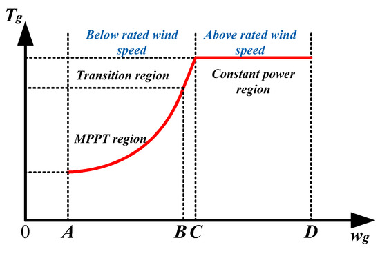 The relationship between the wind turbine speed and generator torque is shown in Figure 3, and its working area can be divided into the maximum wind energy tracking region, transition region, and constant-power region.