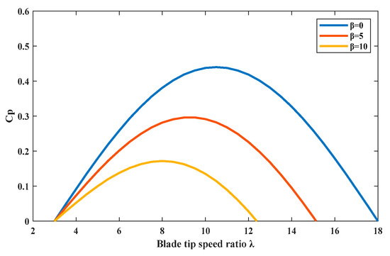 Figure 4 illustrates the relationship between the blade tip speed ratio and the wind energy utilization coefficient of the wind turbine at pitch angles of 0 degrees, 5 degrees, and 10 degrees. In Figure 4, we can see that the optimal blade tip speed ratio λopt of the wind turbine corresponds to its maximum wind energy utilization coefficient Cpmax. When the wind speed changes, as long as the blade tip speed ratio of the wind turbine can be maintained at the optimal λopt, the maximum wind energy can be captured. As we know, the relationship between λopt and wopt is