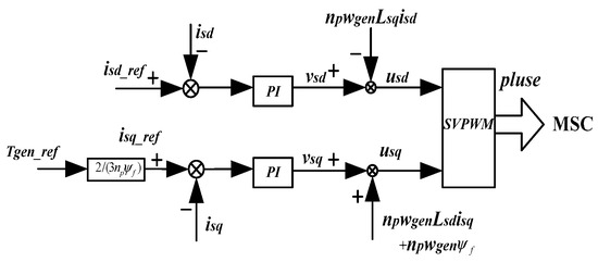 As shown in Equation (4), the OTSR method usually requires calculating wopt based on the wind speed v and then implementing MPPT control by adjusting the speed. The control principle diagram is shown in Figure 5.