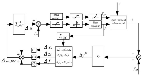 In Equation (2), A is the system matrix, Bc is the pitch control input gain matrix, Bd is the wind speed disturbance input gain matrix, C is the output matrix of the system, and x contains the state of the controlled system. u is the pitch vector; v is the wind speed vector; and y is the measurement value of the system.