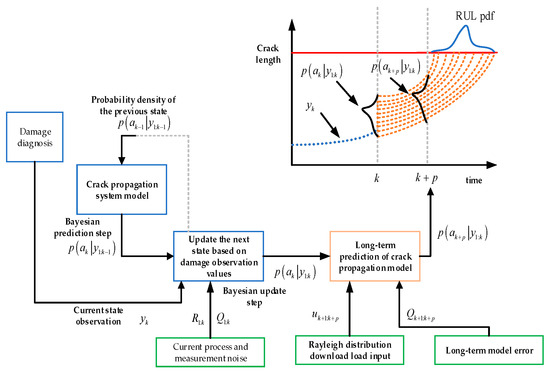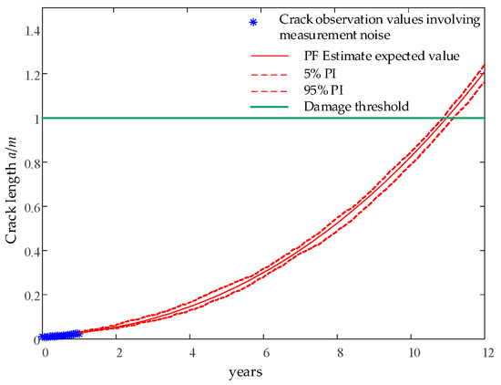 In Equations (25) and (26), wa,k describes the non-Gaussian additive noise of the uncertainty of the damage process model; non-Gaussian additive noise of the uncertainty of measurement process models is defined by vak. In the Bayesian prediction step, the prior probability p(ak|y1:k−1) at time k is estimated by combining the posterior probability p(ak−1|y1:k−1) at time k−1 with the Chapman–Kolmogorov equation, and its expression is as follows: