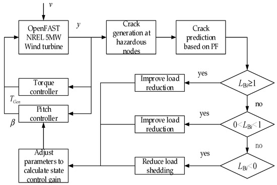 However, reducing the load often accompanies a decrease in power generation and an increase in the blade pitch frequency. To balance and optimize this trade-off, appropriate weight parameters can be set. Reference [17] provides an online damage calculation model to indicate the actual health status of the blade and combines a variable-gain control strategy to balance unit power generation and blade life. This method can extend the blade life at the expense of a small amount of power. However, there is a lack of a predefined life cycle and uncertainty descriptions for future operating conditions. References [18,19], respectively, proposed Multivariate Information Perception You Look Only Once (MIP-YOLO) and a Gated Residual Network (GRN) for crack prediction in blades, which can effectively predict blade cracks. But, these studies did not investigate how to guide controller parameter adjustment based on the crack propagation results and blade life. Reference [20] effectively improved the prediction accuracy of blade crack propagation by combining hyperspectral imaging with 3D convolutional neural networks, providing an effective basis for blade fault diagnosis and life prediction. However, the weight structure of convolutional neural networks is relatively complex and requires a large amount of data for training, which is not conducive to engineering implementation. Based on the above analysis, we can find that the current methods for life prediction, both domestically and internationally, are mainly based on data-driven research. However, there are few methods that combine blade life with unit control. In fact, while conducting life prediction, adjusting the controller parameters of the unit based on the life prediction results can effectively increase the remaining life of relevant, important subsystems. That is to say, the current unit control system not only needs to ensure stable power output and reduce blade load but also needs to ensure the reliability of blade operation and the predefined service life under the requirements of operation and maintenance strategies. For this purpose, this article proposes a blade life adaptive control strategy, which cascades the life control loop onto the main controller loop. The outer loop is based on historical crack observations, and the Paris crack propagation model combined with a particle filtering algorithm is used to calculate the degradation of blade life under the crack threshold conditions provided by the operation and maintenance strategy in order to determine the parameter settings of the inner-loop load-shedding controller. The inner-loop load-shedding controller is mainly designed based on random disturbance correction control to balance the load-shedding capability of the controller and the workload of the pitch actuator while considering the predefined blade life in the operation and maintenance strategy, avoiding unplanned shutdowns, and reducing the total maintenance cost of the unit. The effectiveness of the proposed method was verified through simulation using the NREL 5 MW wind turbine model and the Open FAST-MATLAB platform (2022 version). The main contributions of this article include the following:
