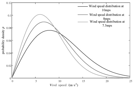The operating range of the NREL 5 MW wind turbine used in this article is from vcut = 3 m/s to the cut-off wind speed vout = 25 m/s. The Rayleigh distribution of wind speeds at the hub height is shown in Figure 11, which determines the average wind speed of the IEC Kaimal turbulence model. The data used in this article are all from the Supervisory Control And Data Acquisition (SCADA) system of the wind turbines at the Guyuan Wind Farm in China; the turbulence intensity is set at 8%, and the average wind speed is updated every 600 s. The probability density function and probability distribution function of the Rayleigh distribution are as follows [26]: