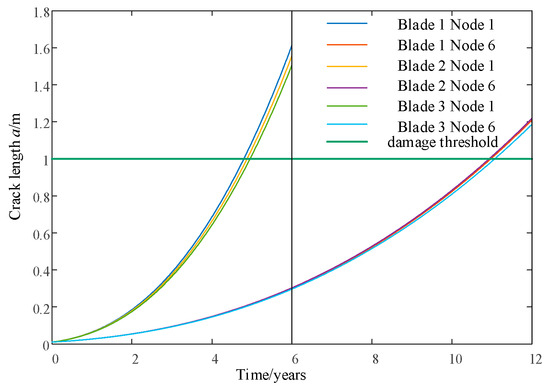 Based on the above operation control strategy, a segmented operation of the entire wind speed range is carried out between the wind speed vcut and the wind speed vout. While updating the wind speed, the time-series data of the flapping bending moment on the key damage nodes of each blade are collected: that is, 30% of the blade length at and above the blade root is node 1 and node 6. The rain-flow counting method is used to calculate the load range and number of cycles, which are used as load inputs for the Paris model to calculate the crack propagation length in the current cycle. The crack propagation observations for nodes at the root and 30% of the blade length of each blade are shown in Figure 12.