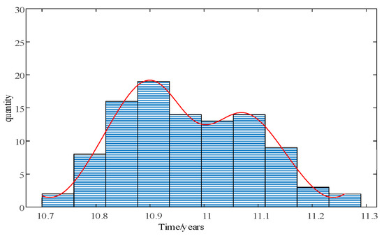 When the values of each particle reach the fault threshold, the life distribution of the blade can be obtained, as shown in Figure 14, which is mainly influenced by the particle distribution. If the model error is small, a smaller Qa and k can be chosen to obtain a narrower range of life distribution, which can provide a more reliable life prediction. Conversely, a larger Qa and k will result in a wider life distribution, making it difficult to provide effective information for maintenance decisions. Particle filtering can provide a large number of particles to fit the distribution of the blade’s end life.