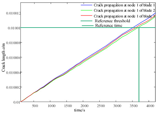 As the weight factor coefficient increases, it can reduce the swinging load borne by each blade, but it will also significantly increase the pitch rate. The integrated control strategy for blade life can adjust the crack propagation rate of each blade at node 1 in Figure 10, reaching the reference crack aref at the specified reference time node Lref, as shown in Figure 19.