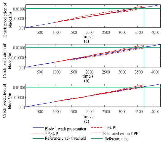 When combined with the 1000th second in Figure 16 and Figure 19, the life estimates Le provided by PF for blades 1 and 3 do not satisfy Lref, while Lb satisfies Lref. Therefore, it is necessary to strengthen the load-shedding capacity of blades 1 and 3, and w2 is sufficient. At 2000 s, the estimated lifespan of each blade using PF, Le, satisfies Lref, so there is no need to improve the load-shedding capacity, and w1 can be used. In Figure 12, it can also be observed that the crack propagation rate significantly slows down after 1000 s and recovers at 2000 s.