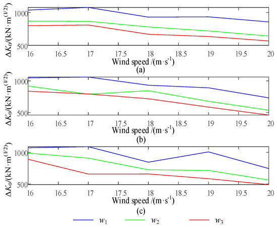 Figure 17a–c respectively represent the stress intensity factor under different wind speeds and weighting factors.