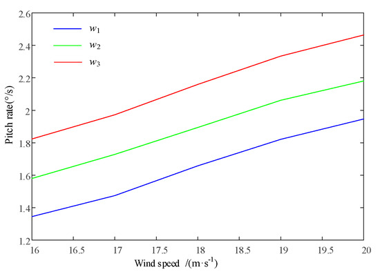 Variation in pitch speed at different wind speeds based on variable load-shedding weight factors.