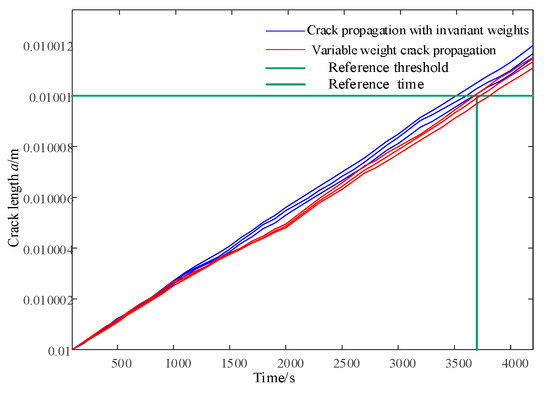 As shown in Figure 16, the integrated control strategy for blade life is applied to predict the life distribution of each blade every 1000 s. The effective life coefficient is calculated to adjust the weight factor w in Equation (43) to change the crack propagation rate, so that blade 1 and blade 2 can reach the reference crack location aref after the reference time node Lref.