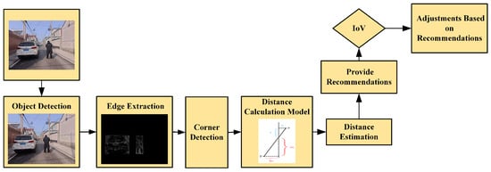 The system is divided into four components: target extraction, edge extraction, distance estimation, and safety recommendations (as shown in Figure 1). The system processes real-time images captured by the camera, performing preprocessing to enhance the accuracy and effectiveness of target recognition and edge extraction. A neural network model, such as YOLOv5x, is used for target recognition to detect objects such as vehicles and pedestrians in the images. The Canny algorithm is applied to extract edges from the images within the detection boxes to enhance the edge information of the targets. Based on the edge information features, distance estimation is performed using the single-image measurement principle of similar triangles. Safety recommendations are generated based on the distance estimates.