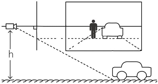 Since the unit of the pixel coordinate system is pixels and the unit of the image coordinate system is millimeters, it is necessary to perform a conversion between the image coordinate system and the pixel coordinate system. As this study focused on a pedestrian safety warning system, the camera was positioned at the street edge, two meters above the ground, capturing images vertically. The shooting effect is shown in Figure 4. Therefore, a method was proposed to calculate the pixel ratio in this plane based on the camera’s height and to calculate the actual distance based on the pixel distance, as shown in Figure 7 (where represents the distance from the person to the camera’s central axis, and represents the distance from the car to the camera’s central axis).