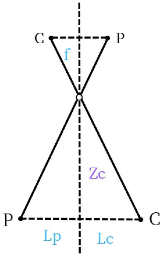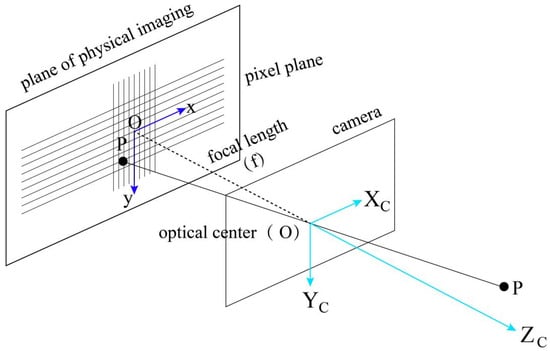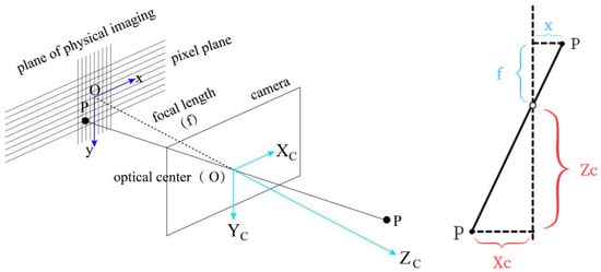 Simplifying the formula, the transformation between the camera coordinate system and the image coordinate system can be based on the pinhole camera model. This process results in the loss of depth information of the spatial points. By analyzing the geometric relationship between the spatial points and the corresponding image points as shown in Figure 5, we can identify similar triangles in the imaging geometric relationship as depicted in Figure 6. Therefore, there is a coordinate transformation as shown in Equation (3), where f is the camera’s focal length.