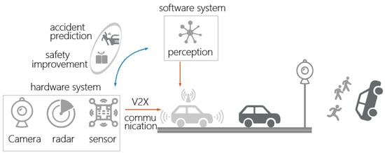 - Application of Vehicle-to-Everything (V2X) technology: When a hazardous distance is detected, the system immediately notifies nearby corresponding vehicles via vehicular network technology (V2X technology). This process involves transmitting alarm information to the vehicle’s onboard system. The driver of the vehicle receives a reminder to slow down and be informed to observe the movements of pedestrians. The onboard system may display relevant warning information and remind the driver to take appropriate action through sound or visual cues [].