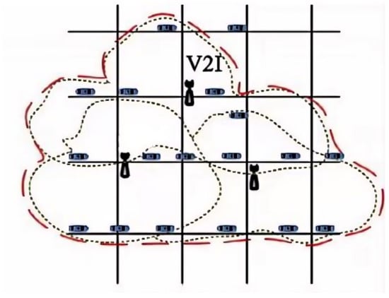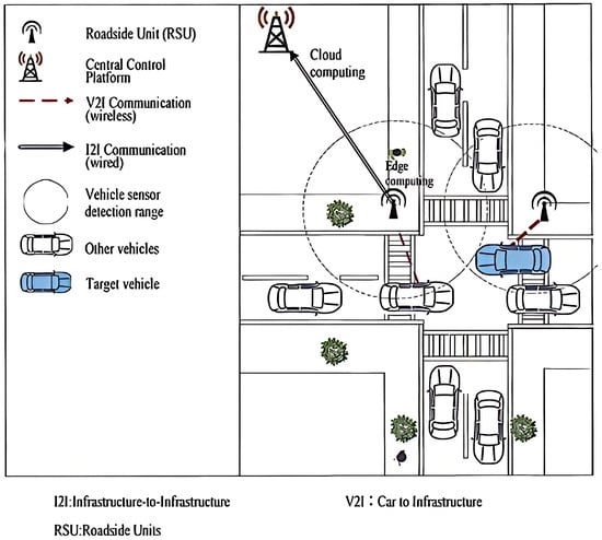 To achieve efficient communication between vehicles and RSUs, this study employed the IEEE 802.11p communication protocol []. IEEE 802.11p is a wireless communication standard specifically designed for vehicular networks, providing low-latency and reliable communication in high-speed mobility environments. The protocol operates in the 5.9 GHz frequency band, enabling stable communication even when vehicles are traveling at high speeds.